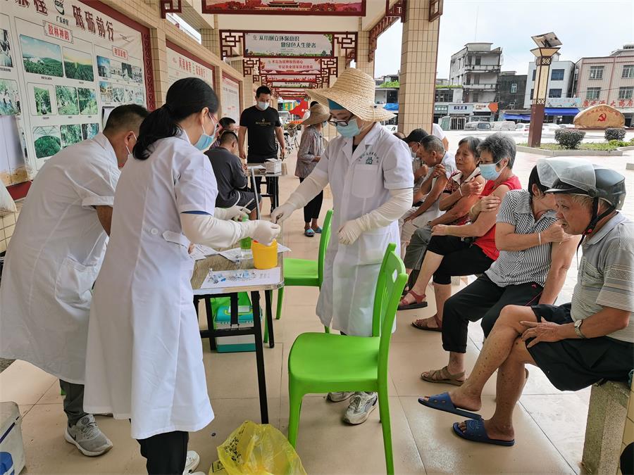 6月16日,建設(shè)農(nóng)場有限公司社區(qū)部工作人員與化州市下郭衛(wèi)生院醫(yī)護(hù)人員在建設(shè)農(nóng)場社區(qū)廣場聯(lián)合開展疫苗接種志愿服務(wù)。