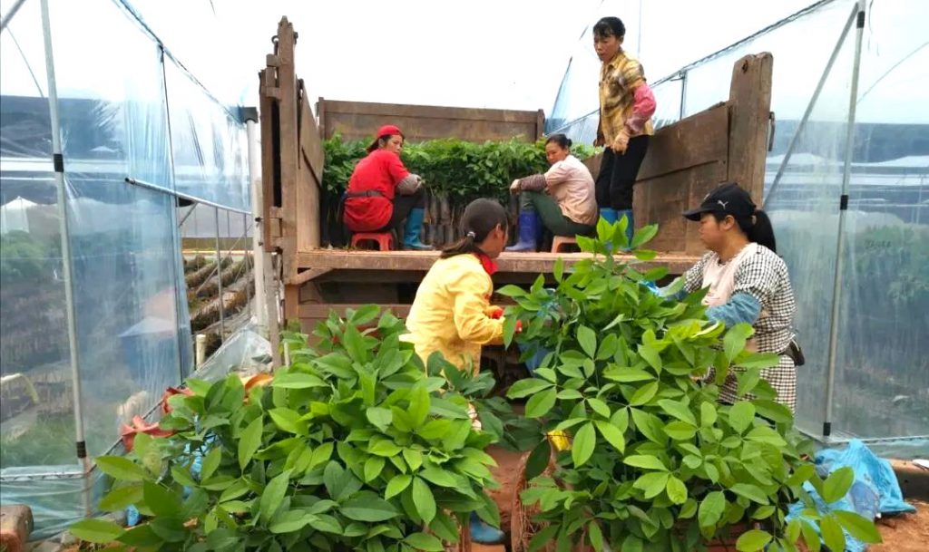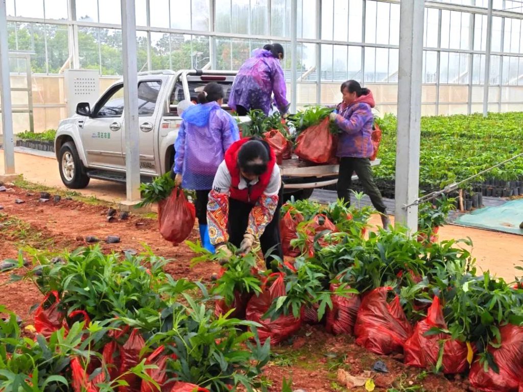 工作人員正在出圃五指毛桃種苗