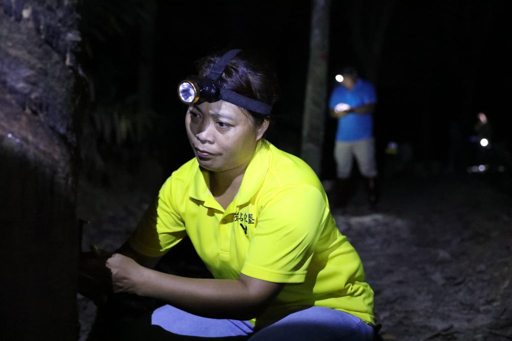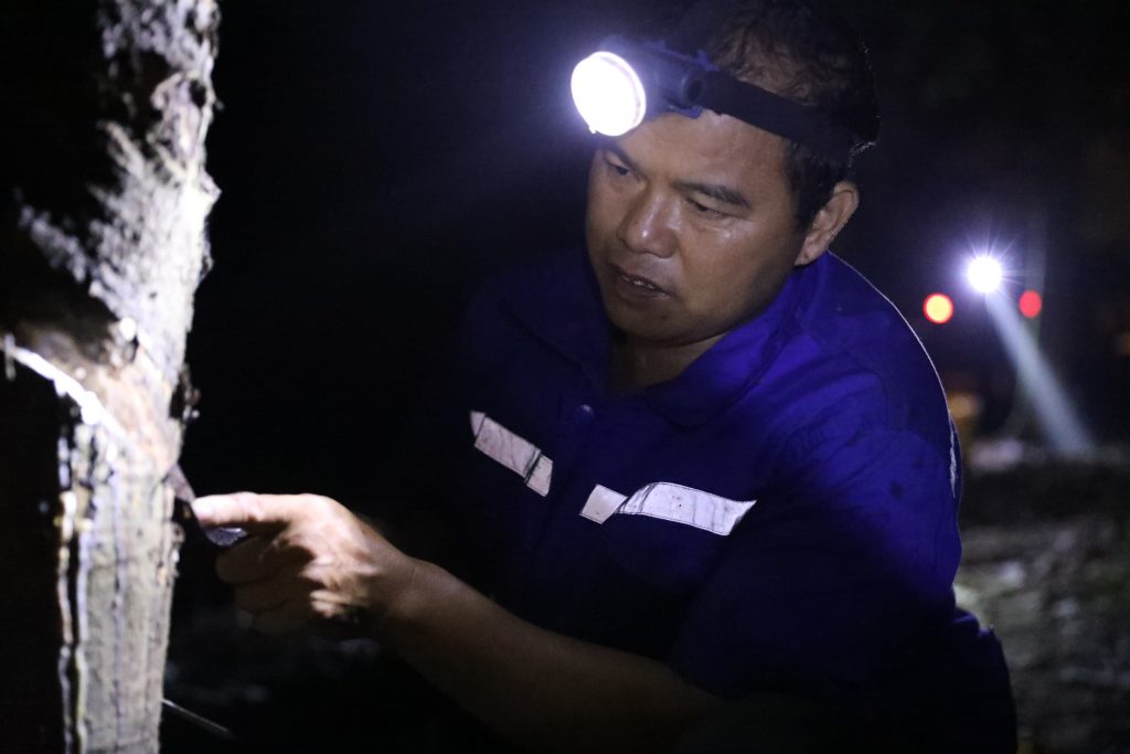 技術(shù)創(chuàng)新驅(qū)動產(chǎn)業(yè)質(zhì)變。“下刀時,身體最好正對上水線,由左手腕用刀,右手拇指和食指捏住下刀翼穩(wěn)定膠刀……”在團結(jié)農(nóng)場培訓現(xiàn)場,全國割膠能手查明飛正示范“三穩(wěn)四準”操作規(guī)范,70名學員在特種膠園中接受毫米級精度訓練。團結(jié)農(nóng)場負責人表示:“每提升1%的割膠規(guī)范度,可延長橡膠樹經(jīng)濟壽命3-5年,這是推動產(chǎn)業(yè)從“量”到“質(zhì)”躍遷的關(guān)鍵突破口?!眲倮r(nóng)場內(nèi),電動膠刀“唰唰”作響,橡膠樹皮迅速翻飛,割膠輔導員邊講解邊示范,學員們屏息凝神看手法、聽指導,認真學習領(lǐng)會低線、反手推刀、陰刀、下刀、收刀等技術(shù)要領(lǐng)。水豐農(nóng)場則設置夜間割膠實戰(zhàn)模擬,通過低光、溫差等復雜環(huán)境訓練,有效提升膠工技術(shù)穩(wěn)定性。