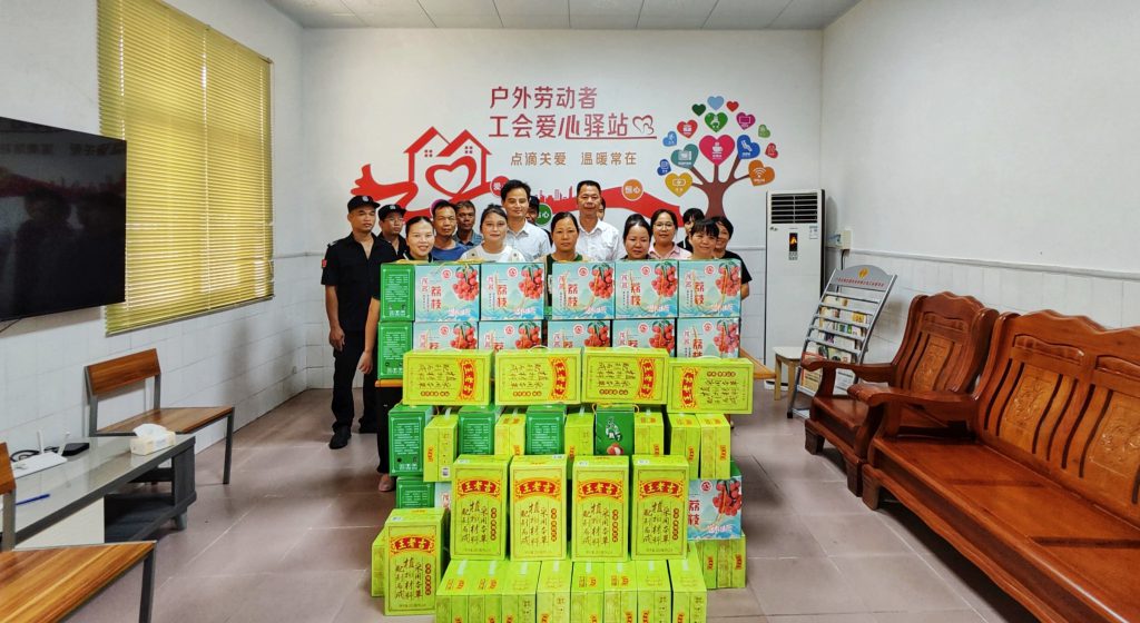 活動(dòng)現(xiàn)場,慰問組為環(huán)衛(wèi)工人、收膠站工人、保安員等一線職工送上荔枝、王老吉飲料、藿香正氣水、清補(bǔ)涼等防暑降溫物資,以實(shí)際行動(dòng)讓職工們感受到絲絲清涼和濃濃暖意。慰問組詳細(xì)了解他們的工作環(huán)境和身體狀況,并對他們的辛勤工作表示感謝,叮囑他們要合理安排工作時(shí)間,注意防暑降溫,確保自身安全和健康。