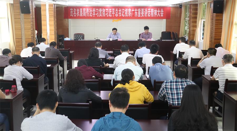 茂名農(nóng)墾局召開傳達學習貫徹習近平總書記視察廣東重要講話精神大會 11月2日,茂名農(nóng)墾局召開了傳達學習貫徹習近平總書記視察廣東重要講話精神大會,學習傳達習近平總書記視察廣東的重要講話精神。茂名農(nóng)墾局在家的領(lǐng)導潘飛、陳永光、林勝榮出席會議,機關(guān)全體黨員干部參加。